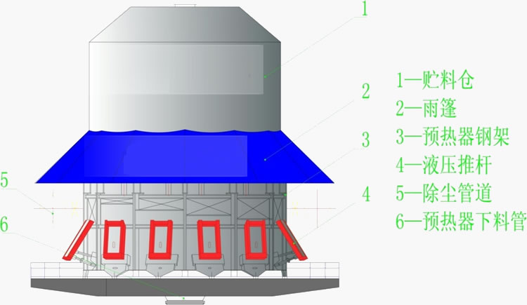 主要包括上部料倉、下料溜槽、料倉支架及結構。保證在向預熱器本體內給料時實現安全密閉,這樣外界的冷空氣不能進入到預熱器內,并且供料可以借助棒條閥實現連續或間斷給料。