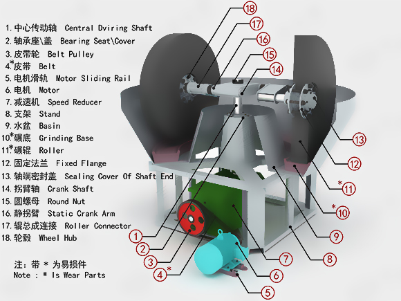 濕碾機(jī)采用輪動式磨礦的工作方式:首先電動機(jī)將動力傳動至減速機(jī),在減速機(jī)帶動下,通過大立軸將力矩傳遞給上方的橫軸,然后經(jīng)安裝在橫軸兩端的拉桿傳遞至碾輪,使碾輪產(chǎn)生驅(qū)動力,沿橫軸水平方向做逆時針旋轉(zhuǎn)運動;工作時的碾輪既能圍繞濕碾機(jī)大立軸公轉(zhuǎn),又能圍繞碾輪中心軸進(jìn)行自轉(zhuǎn),碾盤則固定不動。添加的礦石物料,在碾磨機(jī)內(nèi)受到來自碾輪自身重量帶來的擠壓力,碾輪公轉(zhuǎn)自轉(zhuǎn)時與碾盤產(chǎn)生的巨大摩擦力,在受到反復(fù)的擠壓、揉搓、研磨后,被徹底粉碎。