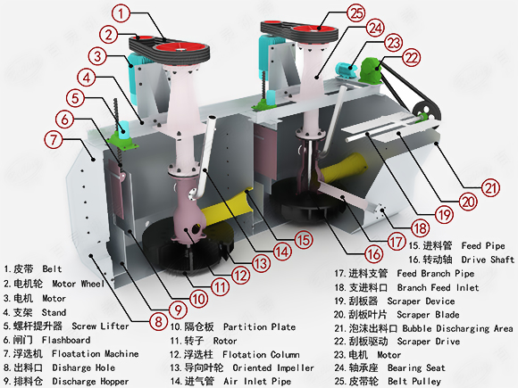 2、葉輪帶有后傾式雙面葉片,可實現(xiàn)槽內(nèi)礦漿雙循環(huán);前傾式槽體,死角小,泡沫運動速度快。