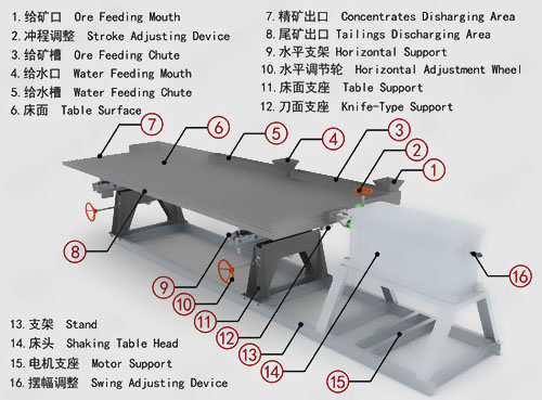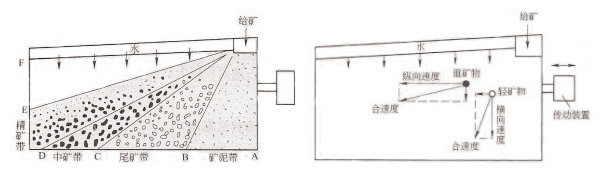 在縱向,床面的差動運動、(起初以慢速前進并逐漸加速,到速度達最大時突然后退,后退過程中速度逐漸減小,然后又前進,重復上述過程)不僅促進礦砂層松散分層、而且使重礦粒以較大速度沿縱向向前運動,使輕礦粒以較小速度向前運動。