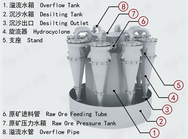 水力旋流器結(jié)構(gòu)設(shè)計(jì)獨(dú)特,采用多段式柱體復(fù)合結(jié)構(gòu),可根據(jù)需要增減柱體高度,若高度增加,溢流細(xì)度提高,可達(dá)10微米左右;并且每個(gè)直徑都有獨(dú)特的筒體長度和錐角組合,可在最小的總旋流器長度情況下達(dá)到最大的切線速度,從而增大物料的離心力,提高分級效率。
