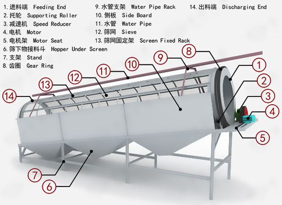 滾筒篩主要有電機、減速機、滾筒裝置、機架、密封蓋、進出料口組成。筒體一般分三段,可視具體情況而定,篩孔由小到大排列,每一段上的篩孔孔徑相同。為了提高篩分效率,物料在滾筒篩內(nèi)移動的速度不能太快,否則將造成篩分不充分、不徹底,因此滾筒篩一般都有嚴格規(guī)定的安裝傾角,通常來說角度為5°,在實際情況下,可根據(jù)需要進行調(diào)整。滾筒段是通過螺母、螺釘與滾筒篩轉(zhuǎn)盤相連接的,因此滾筒段的安裝與拆卸比較方便。由于滾筒段與轉(zhuǎn)盤相連,當轉(zhuǎn)盤在驅(qū)動裝置的驅(qū)動下發(fā)生轉(zhuǎn)動時,滾筒段也跟著一起轉(zhuǎn)動。